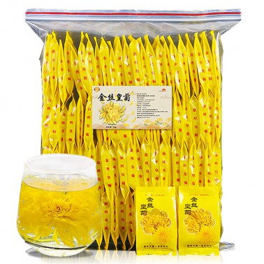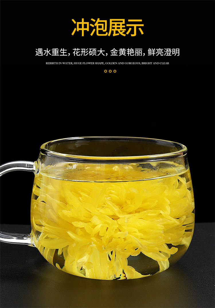 菊花茶,是一种以菊花为原料制成的花草茶。菊花茶经过鲜花采摘、阴干、生晒蒸晒、烘培等工序制作而成。据古籍记载,菊花味甘苦,性耐寒,有散风清热、清肝明目和解毒消炎等作用。菊花茶起源于唐朝,至清朝广泛应用于民众生活中。