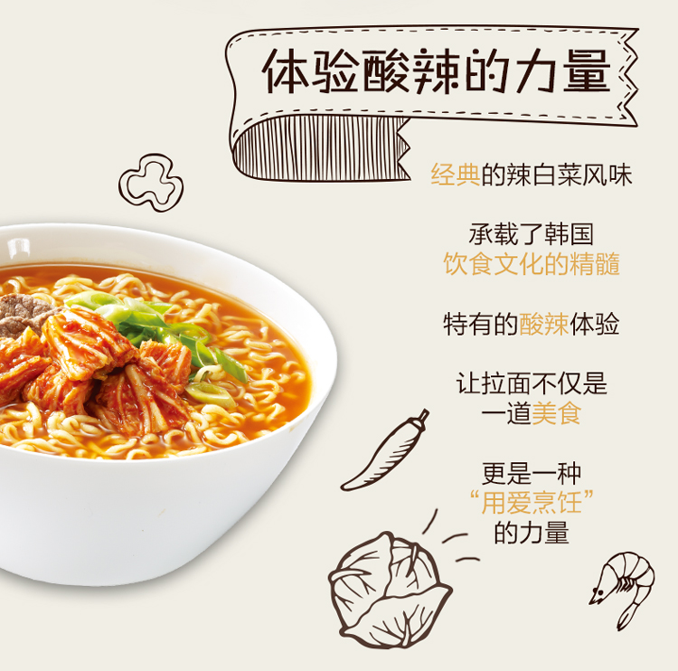 1986年,第一包辛拉面在韩国诞生,1998首次进入中国市场。自辛拉面诞生截止至今,辛拉面已有袋装,五连包,杯面和大碗面4种规格。将辣椒粉,葱,生姜进行相结合,同时配上面条,这就是辛拉面。