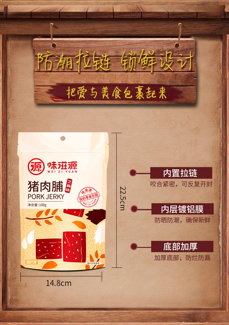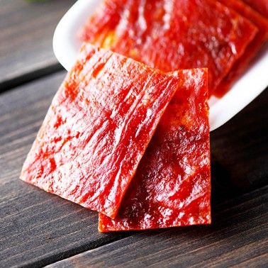 猪肉脯是一种用猪肉经腌制、烘烤的片状肉制品,食用方便、制作考究、美味可口、耐贮藏和便于运输的中式传统风味。其色泽呈鲜艳的棕红色。需选用新鲜猪肉后腿部分,剔去皮、膘、筋骨,取其整块纯瘦肉为基本原料。