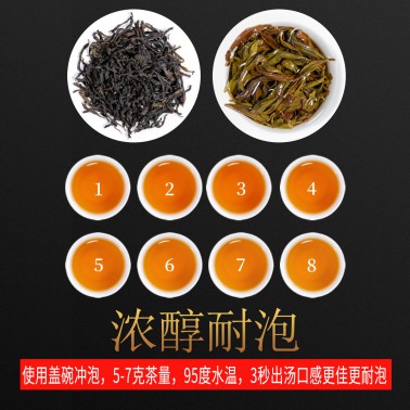 成品茶外形条索粗壮,匀整挺直,色泽黄褐,油润有光,并有朱砂红点;冲泡清香持久,滋味浓醇鲜爽,润喉回甘,具独特的山韵。凤凰单丛茶形美、色翠、香郁、味甘,有诗云“愿充凤凰茶山客,不作杏花醉里仙”。