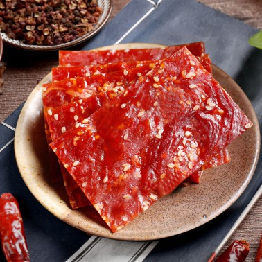 猪肉脯是一种用猪肉经腌制、烘烤的片状肉制品,食用方便、制作考究、美味可口、耐贮藏和便于运输的中式传统风味。其色泽呈鲜艳的棕红色。需选用新鲜猪肉后腿部分,剔去皮、膘、筋骨,取其整块纯瘦肉为基本原料。